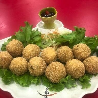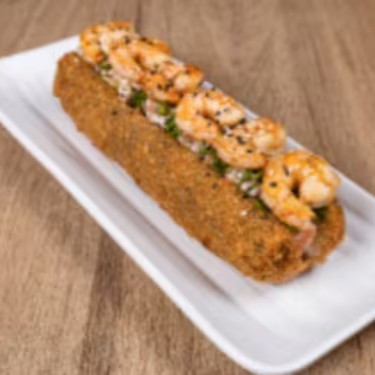 Arroz, camarão e cream cheese, todo empanado na farinha panko e frito.