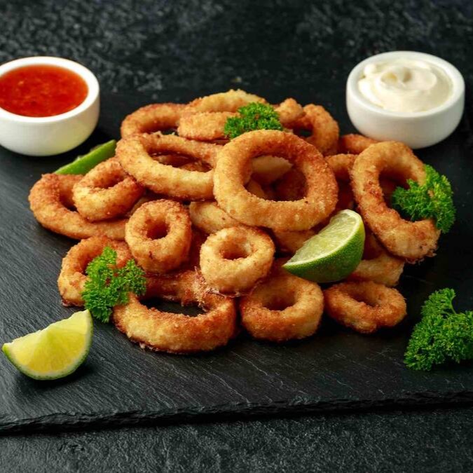 Porção de aproximadamente 300 gramas com 12 anel de lula empanada.