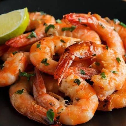 Porção e aproximadamente 300 gramas de camarão com casca e sem cabeça temperados.
