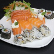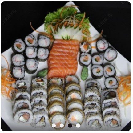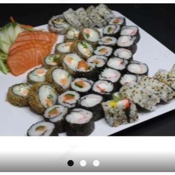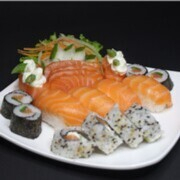 8 Sashimis de Salmão, 10 hot holl, 10 hossomakis salmão, 10 uramakis skin, 10 kani maki e 10 uramakis de salmão.