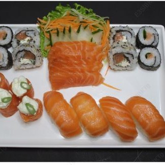 10 hossomakis de salmão,10 uramakis de salmão,10 hot holl, 5 niguiris de salmão, 5 joe de salmão, 5 sashimis de salmão.