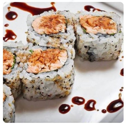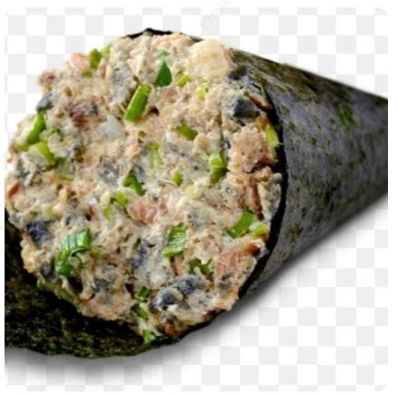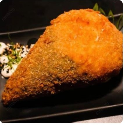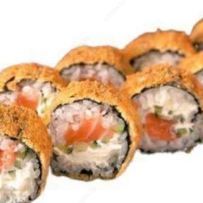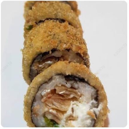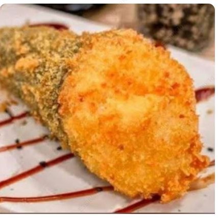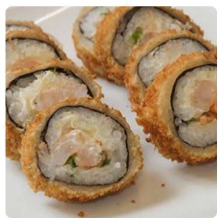 Salmão, arroz, cream cheese, cebolinha, empanado na farinha panko e frito.