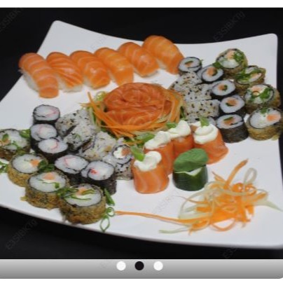 5 sashimis de salmão,10 hot holl,10 hossomakis de salmão,10 kani makis, 5 uramakis Califórnia,5 urumakis skin.