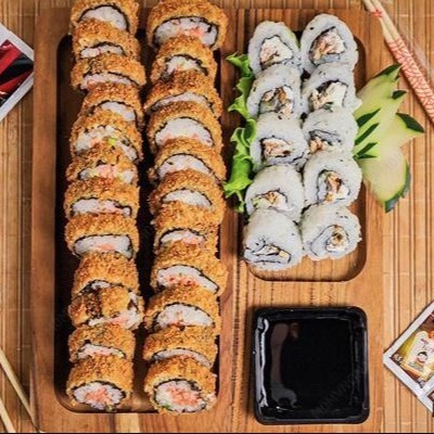 44 peças = 10 hots, 6 makimonos california, 6 makimonos filadelfia, 6 makimonos skin, 6 uramaki salmão, 6 uramaki california, 2 sushi salmão, 2 sushi kani.