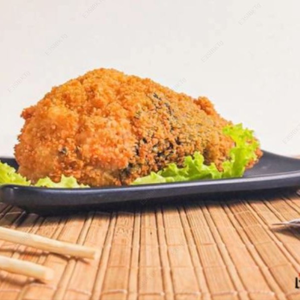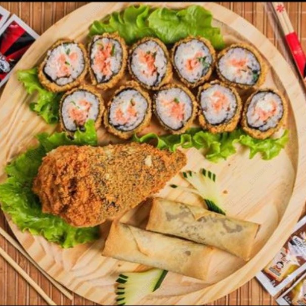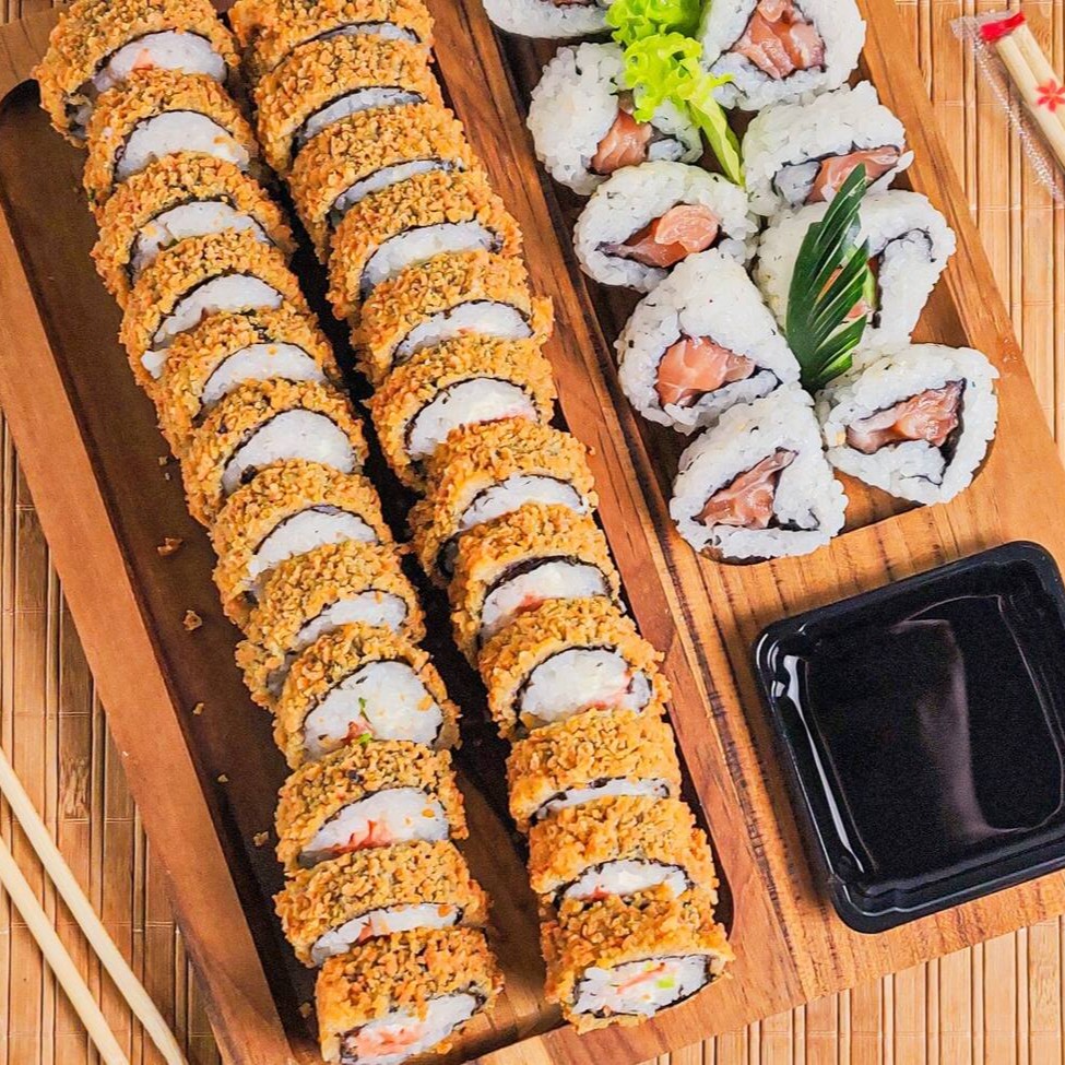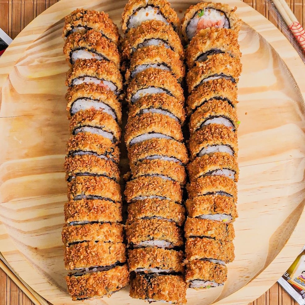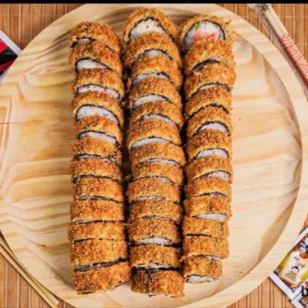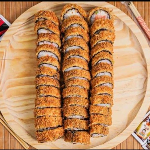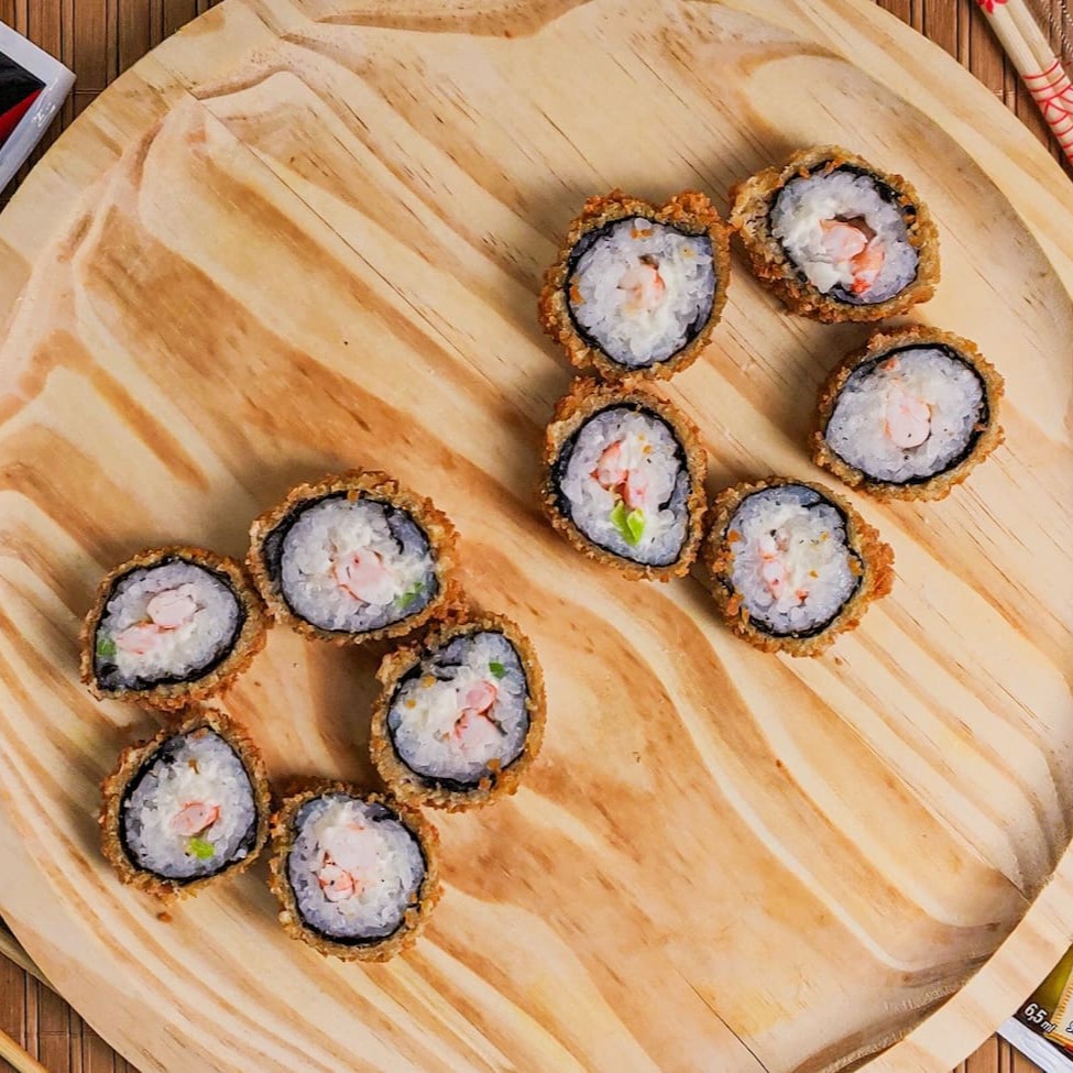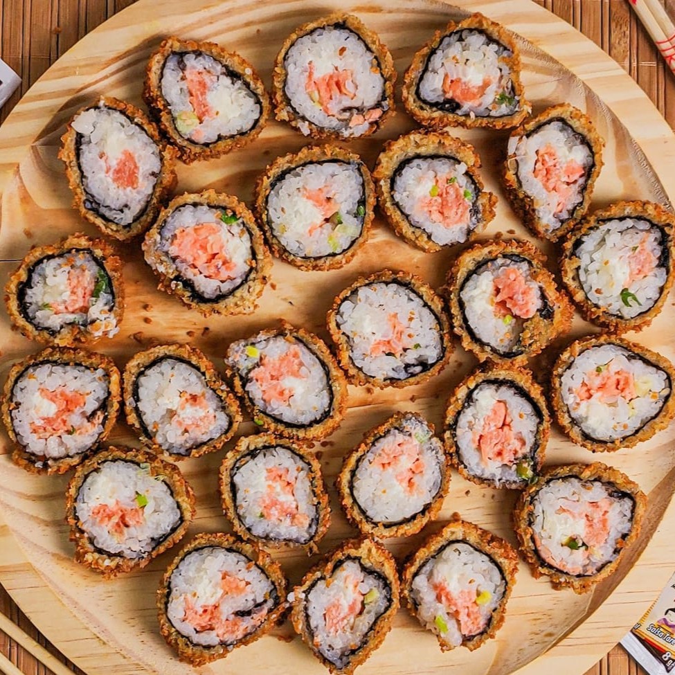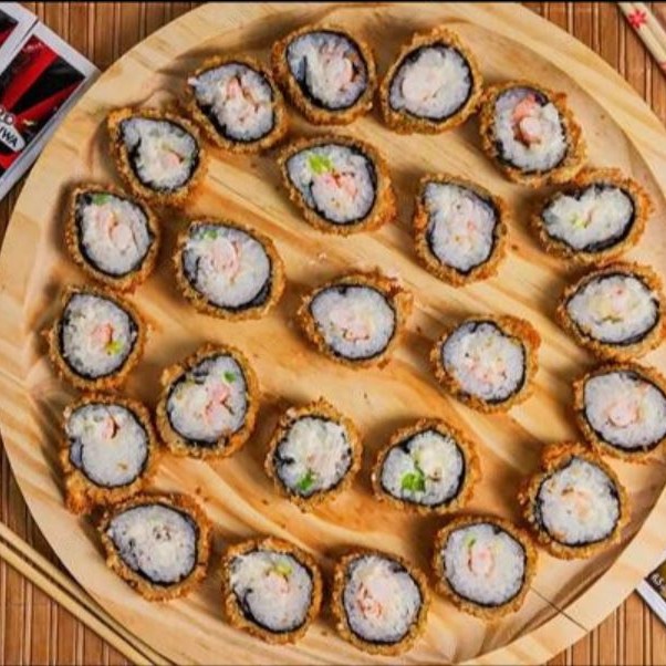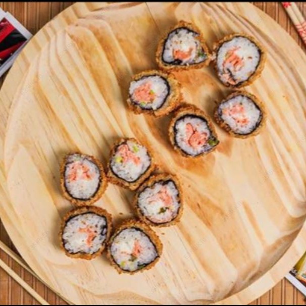 Alga, arroz, salmão, cream cheese, cebolinha, empanado na farinha panko e frito.