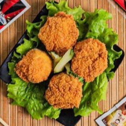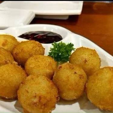 Arroz, camarão, cebolinha, cream cheese, empanado na panko e frito.