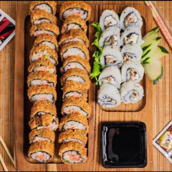 44 peças = 10 hots, 6 makimonos california, 6 makimonos filadelfia, 6 makimonos skin, 6 uramaki salmão, 6 uramaki california, 2 sushi salmão, 2 sushi kani.