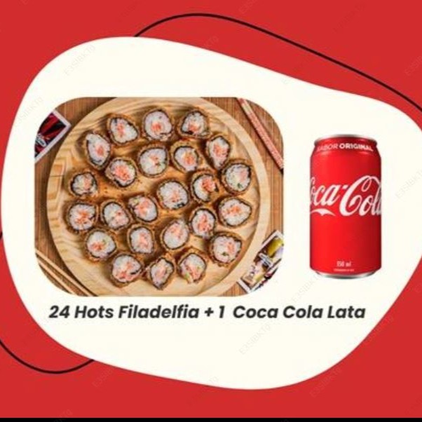36 Hots Diversos(12 hots Filadelfia - 12 hots salmão grelhado - 12 hots camarão) + 2 RefrigeranteCoca Cola Lata 350 ML