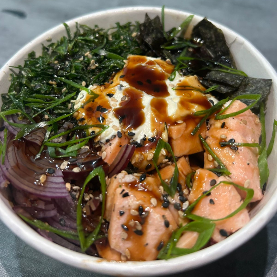 Tigela preparada com arroz temperado, proteínas e ingredientes selecionados.
