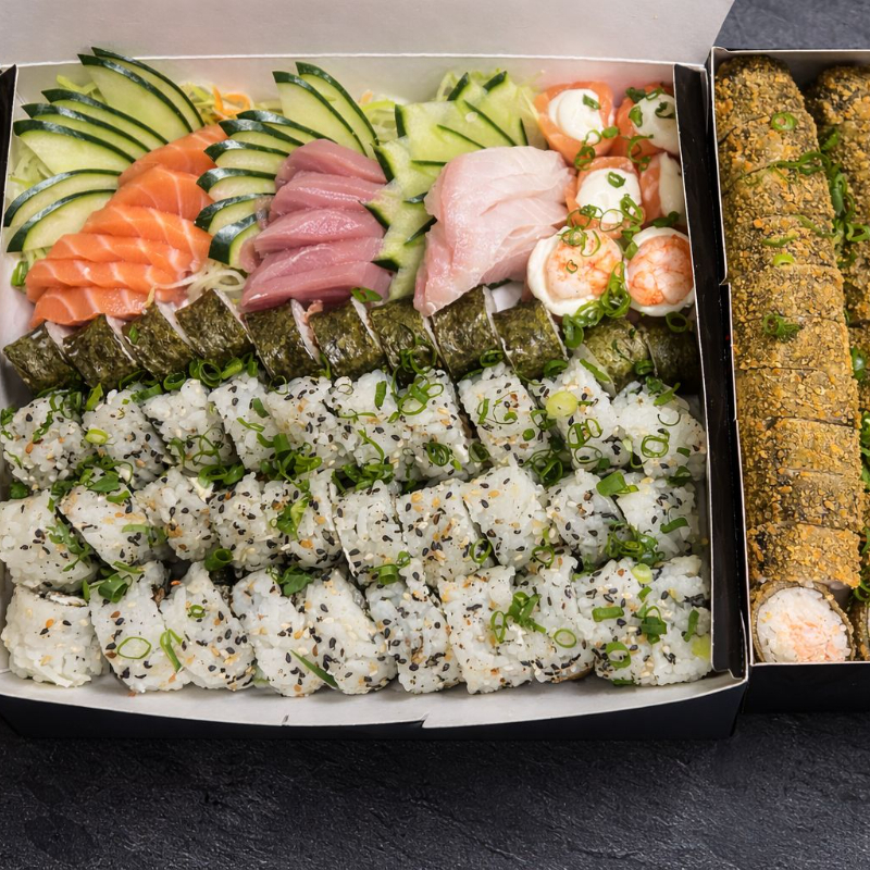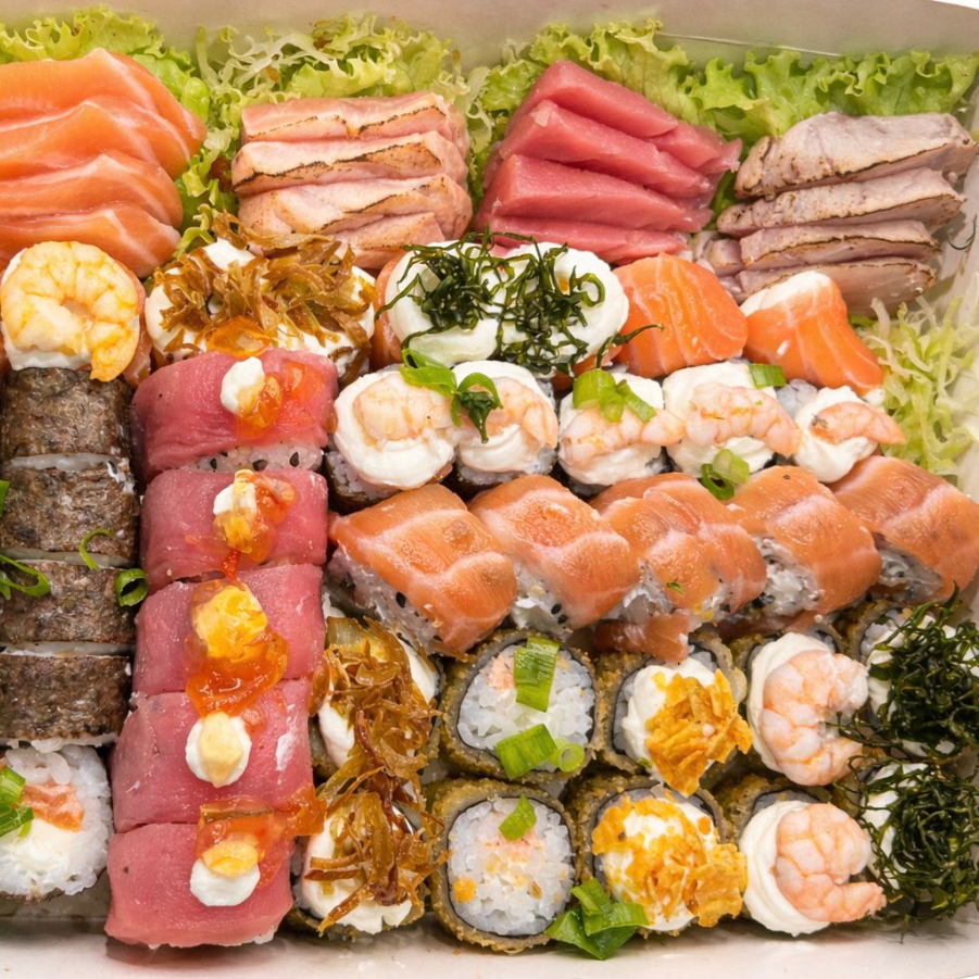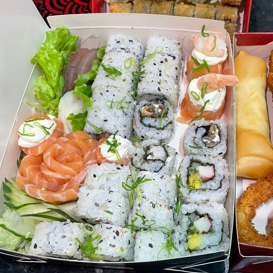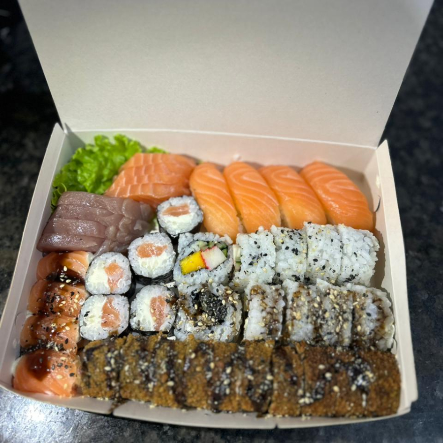 5 sashimi de salmão, 7 sashimi de atum, 5 sashimi de peixe branco, 2 gunka eby, 4 gunka sem arroz, 10 eby uramaki, 20 skin , 10 Filadélfia, 20 hot Filadélfia, 2 espetinhos de camaão, 2 robatas de frango, 3 lula empanado , 2 harumakis salgado, 2 harumakis doces