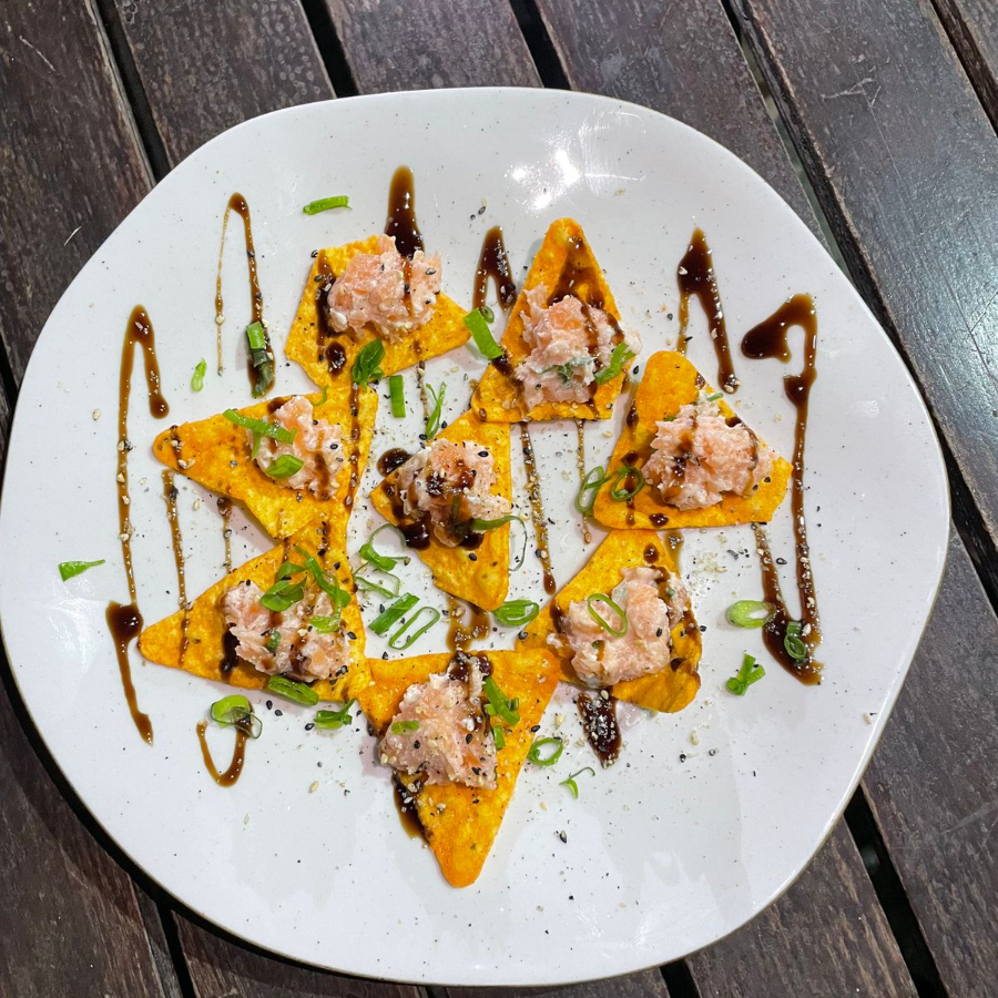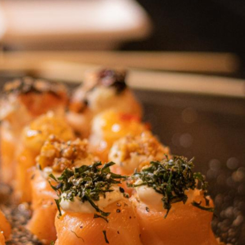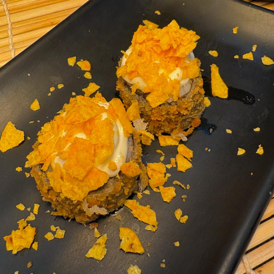 Sushi empanado e frito com doritos, recheado com salmão e cream cheese cremoso.