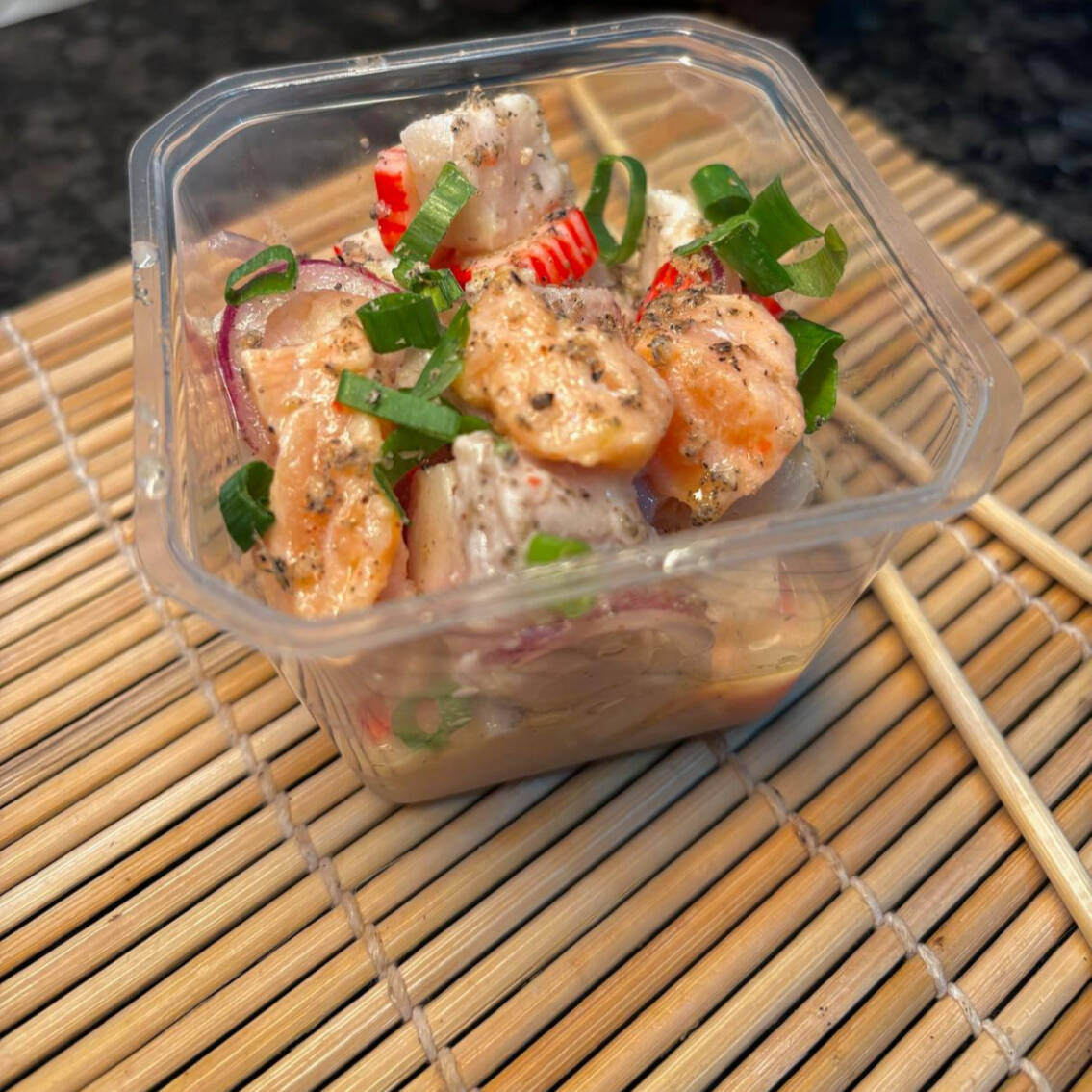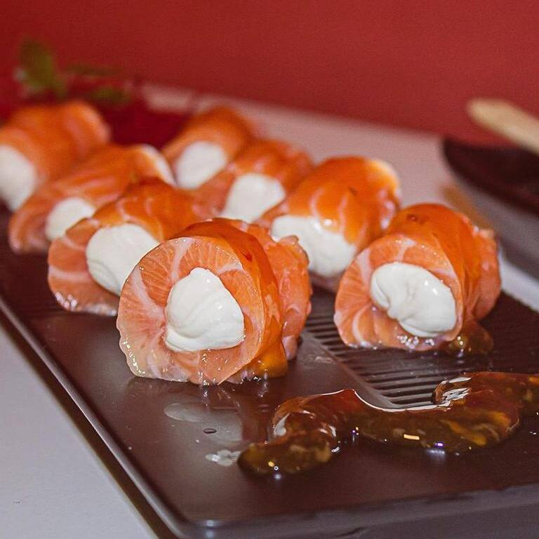 Base de arroz, salmão, cream cheese e geleia de pimenta.