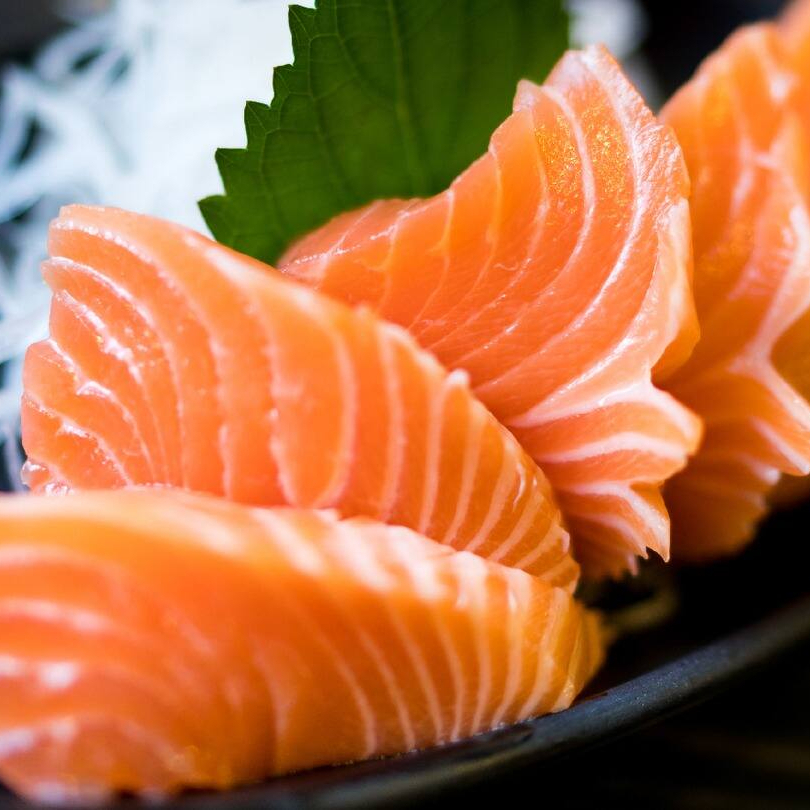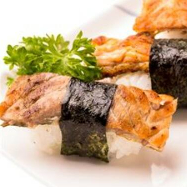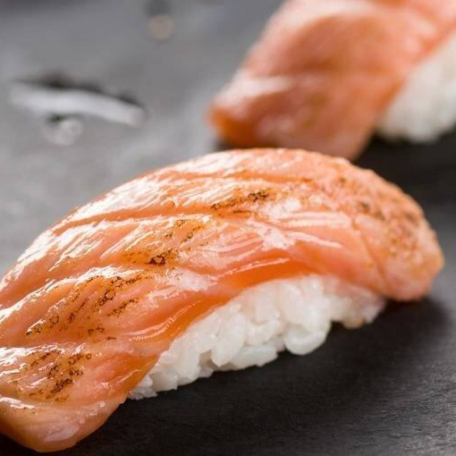 Fatia de salmão levemente maçaricada sobre arroz de sushi.