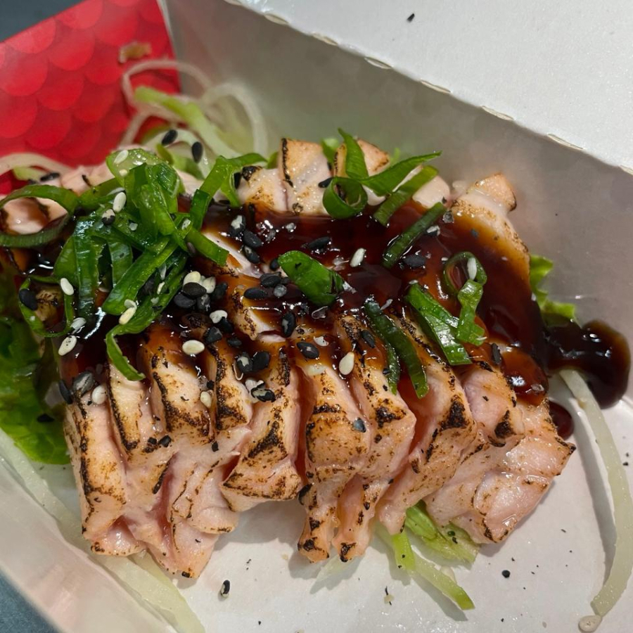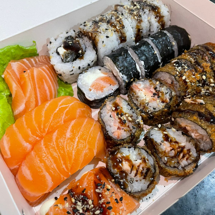 5 hot filadélfia, 5 filadélfia, 8 sashimi salmão, 4 sushi de salmão, 4 gunk eby.