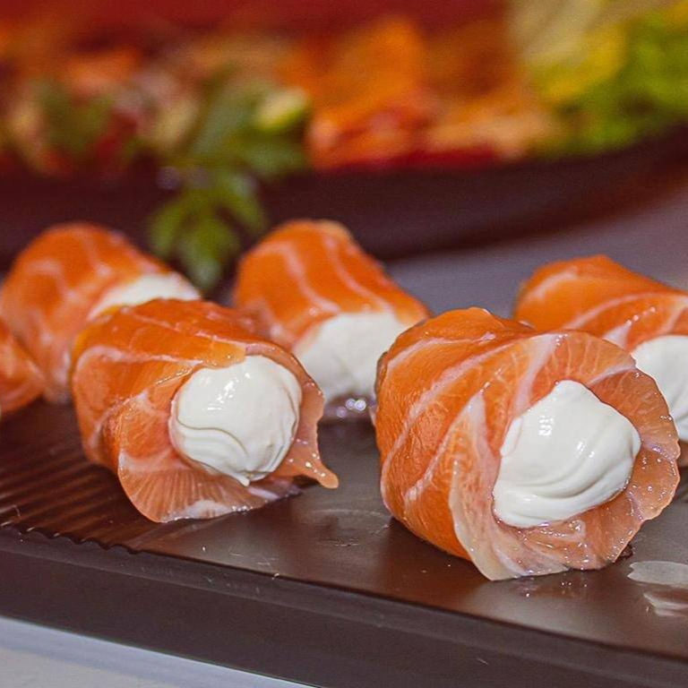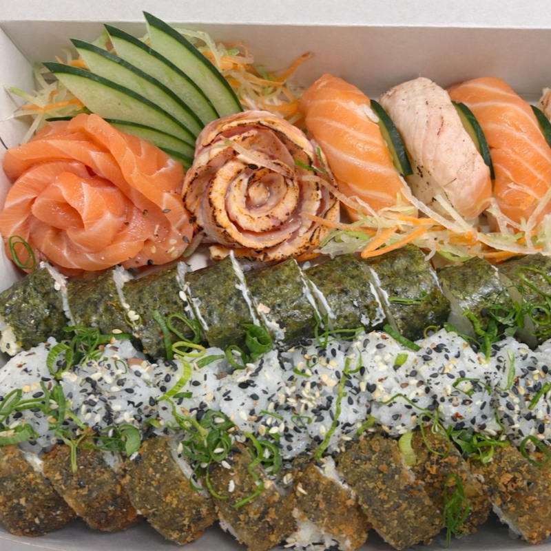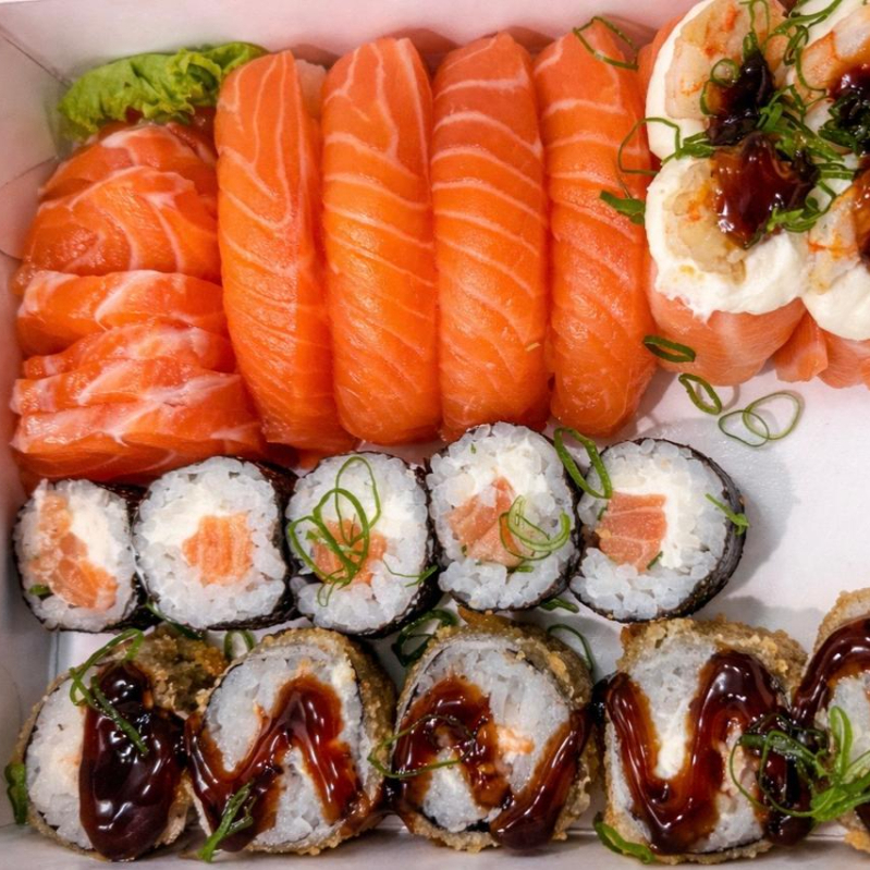 10 sashimi de salmão, 2 sushi de salmão, 4 gunka sem arroz, 10 filadélfia, 10 hot filadélfia, 5 filadélfia uramaki.