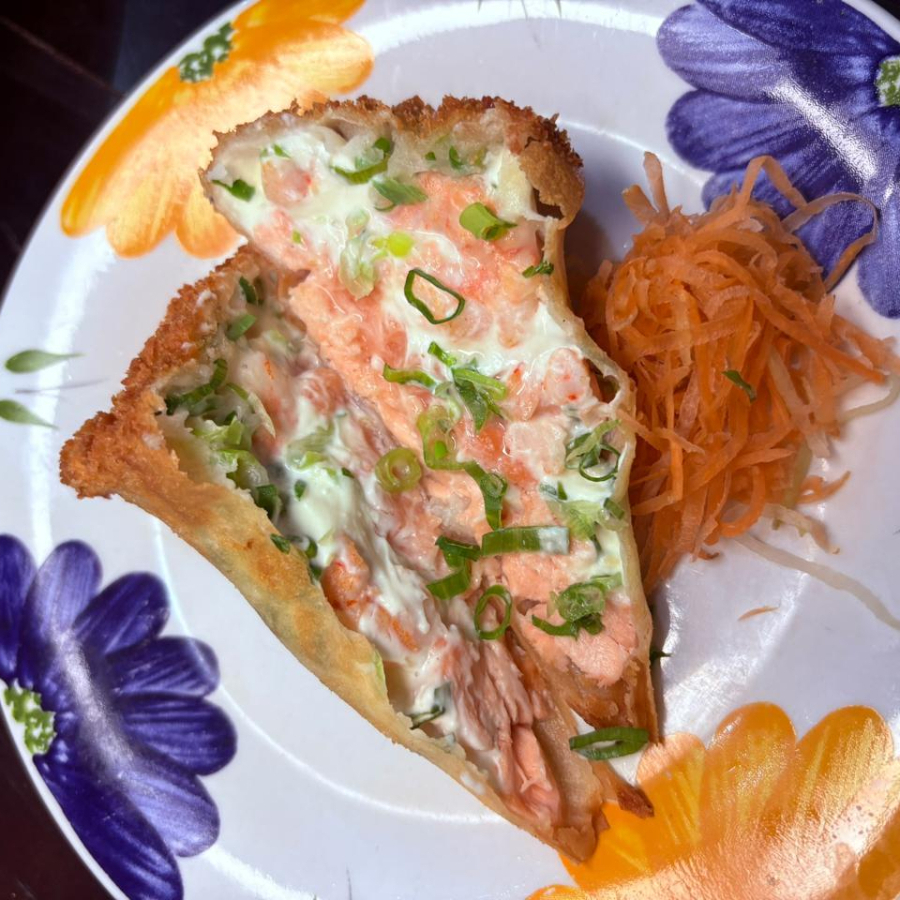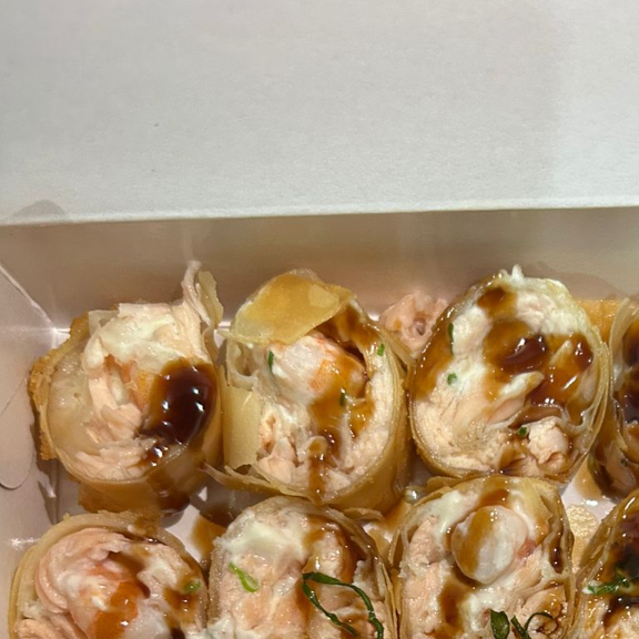 Rolinho primavera crocante, recheado com salmão e cream cheese.