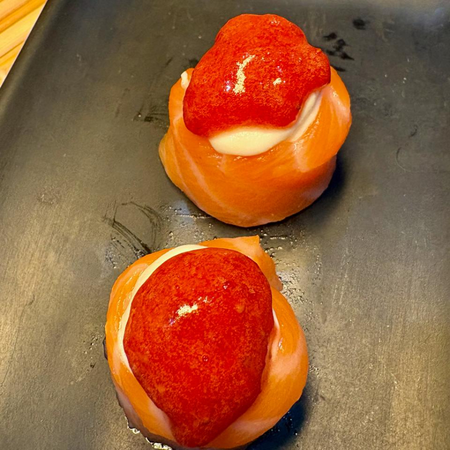 Base de arroz, salmão, cream cheese e geleia de morango.