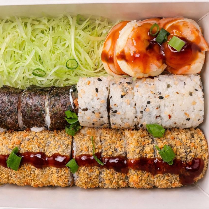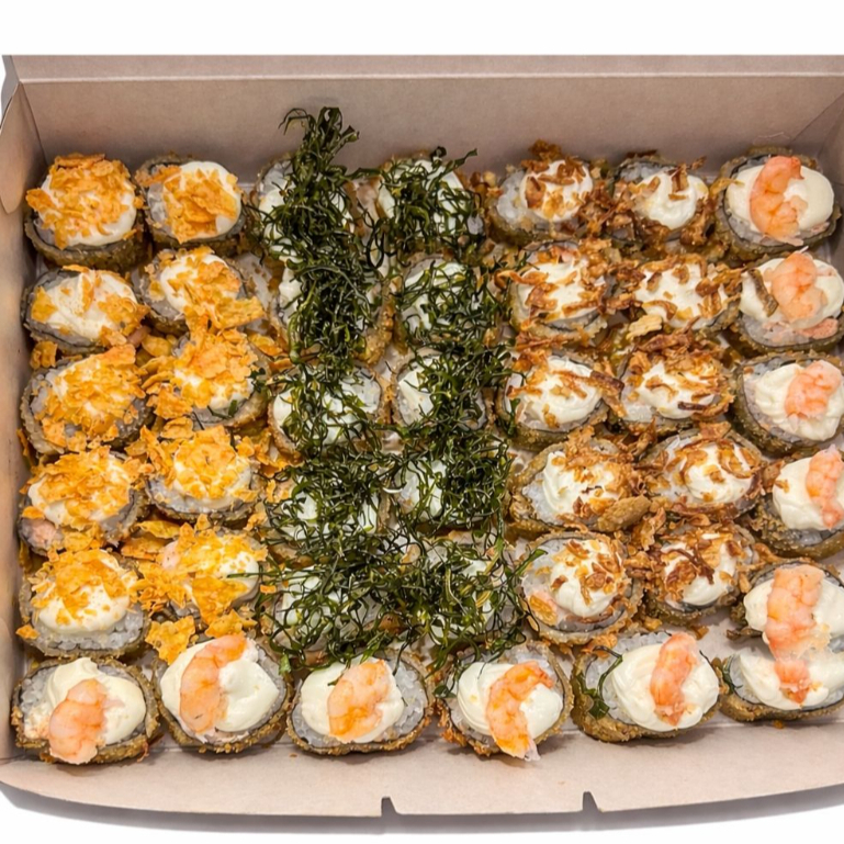 Base de arroz de sushi com cream cheese cremoso e cobertura crocante.