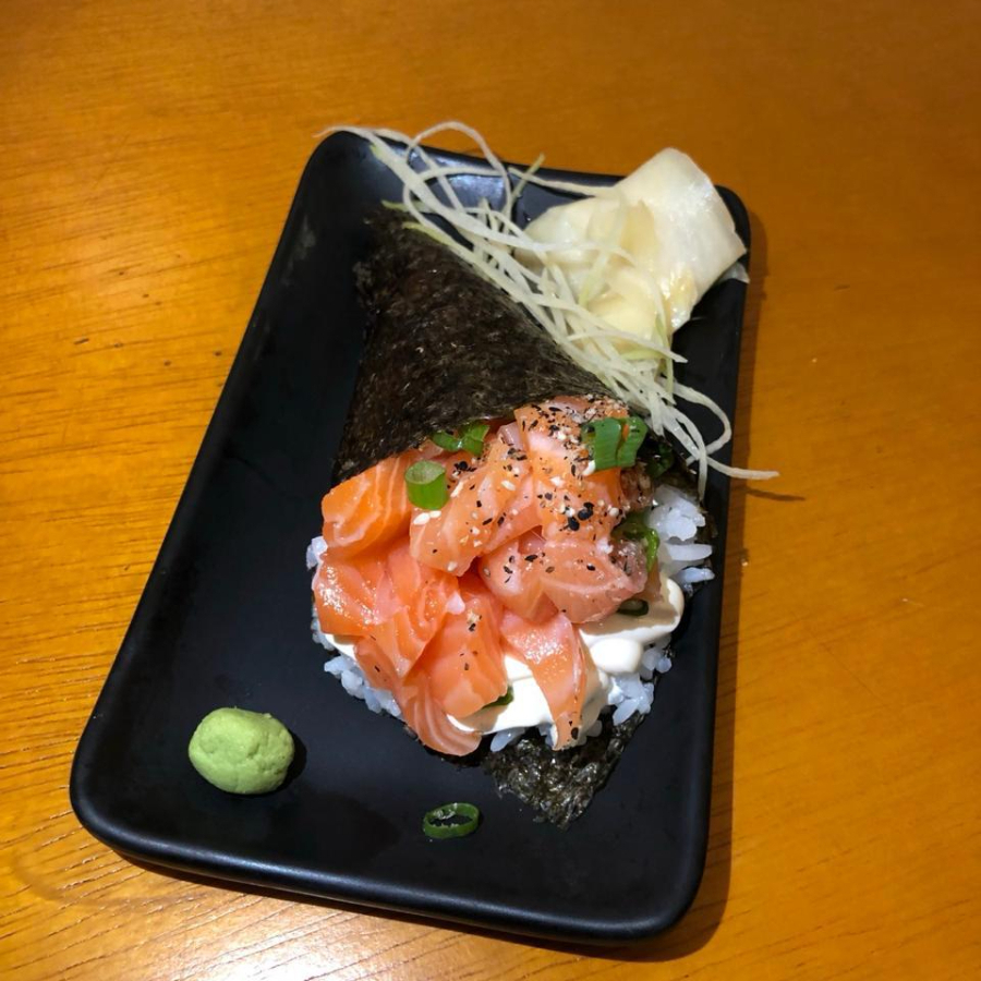 Temaki frito com casquinha de harumaki, salmão, arroz e cream cheese.
