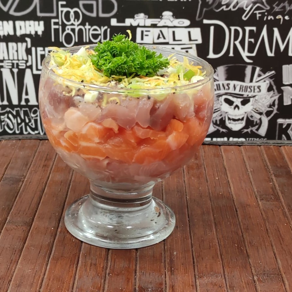 Saladinha do peixe que você escolher marinado no suco de limão com azeite, cebola roxa, pimenta biquinho e Crispy.