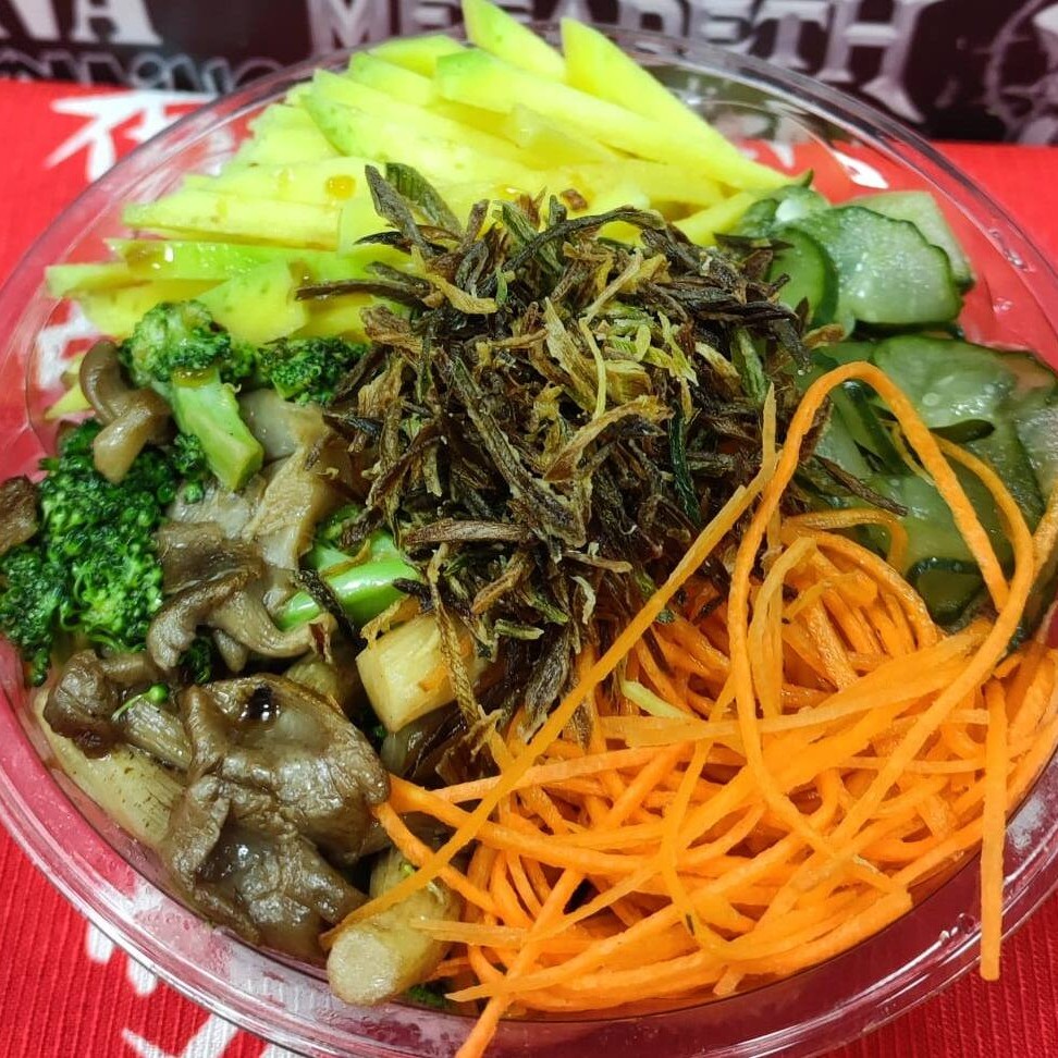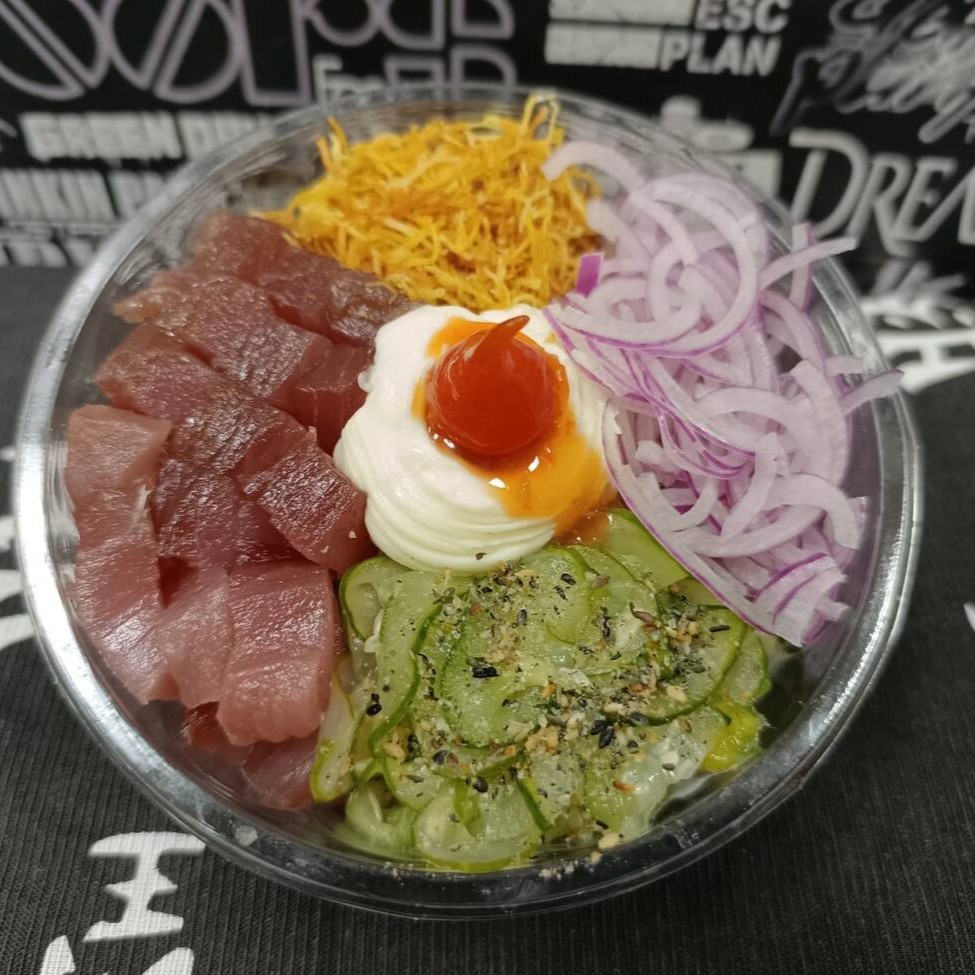 Saladinha sem arroz, com aproximadamente 180g do peixe da sua preferência, finalizado com cebolinha, gergelim e Crispy.