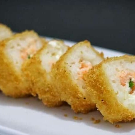 Bolinhas de mix de peixe com arroz, cream Cheese, Alho Poró e tempero especial Sushi Rock + Molho.