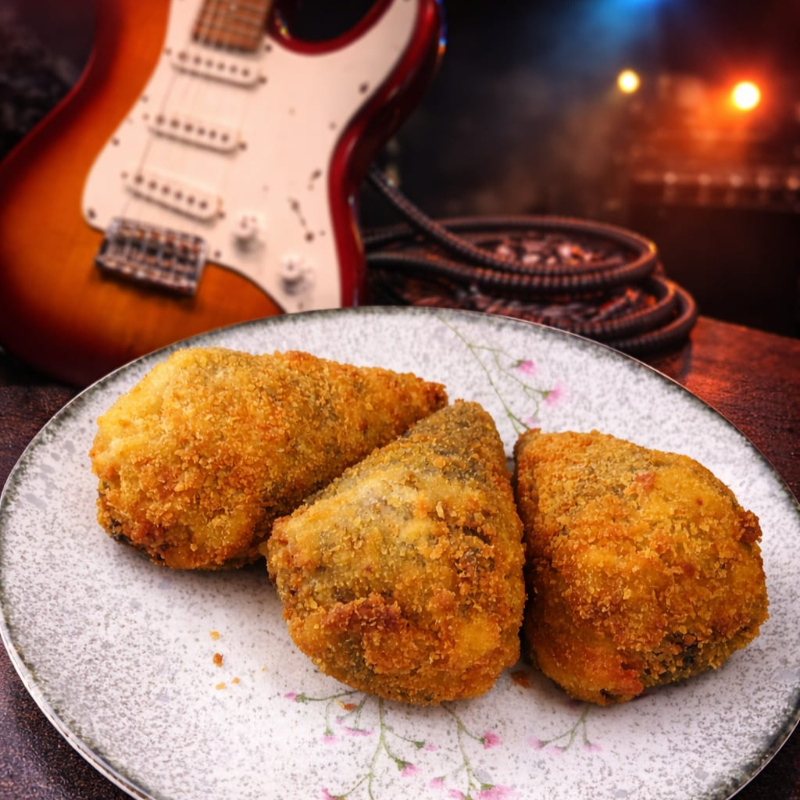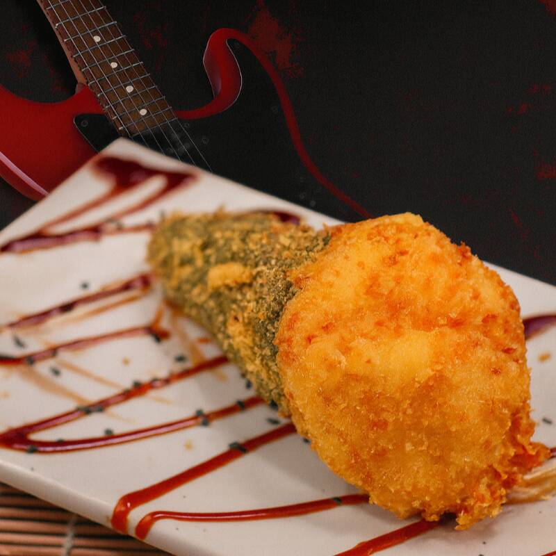 Arroz temperado, SKIN grelhado com cream cheese… tudo empanado, frito e afinado no volume máximo do sabor! 🎸🔥