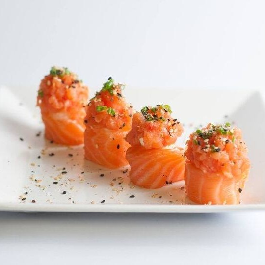 Arroz cobertos por uma lâmina do seu peixe favorito: Salmão, atum, peixe branco, polvo, entre outros.