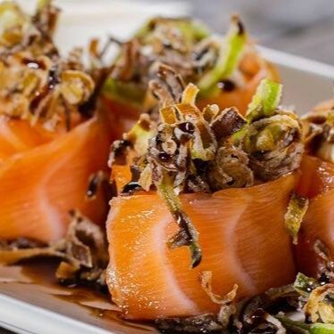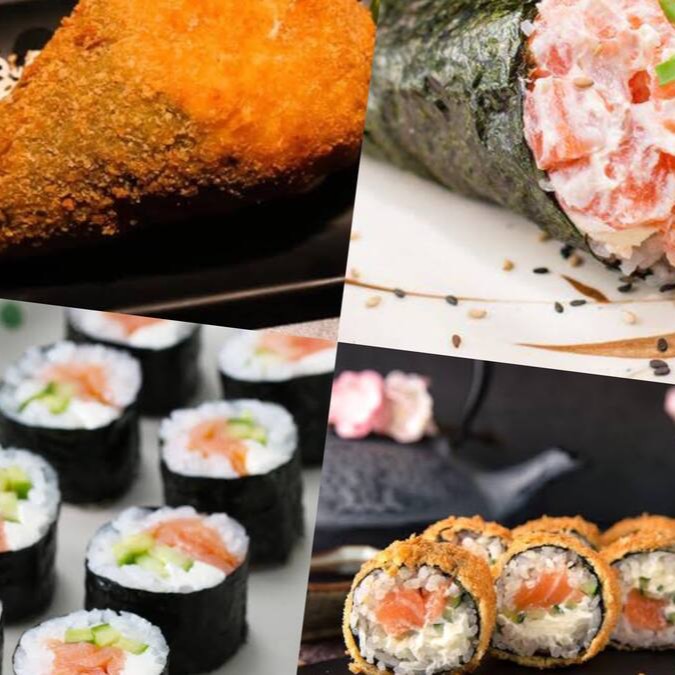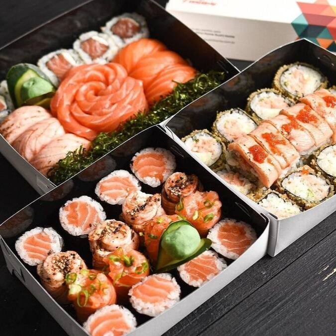IMAGEM ILUSTRATIVA - No combo vai: 02 sashimi de salmão + 04 Filadélfia + 04 salmão, cream cheese e alho poró + 01 sushi de salmão empanado