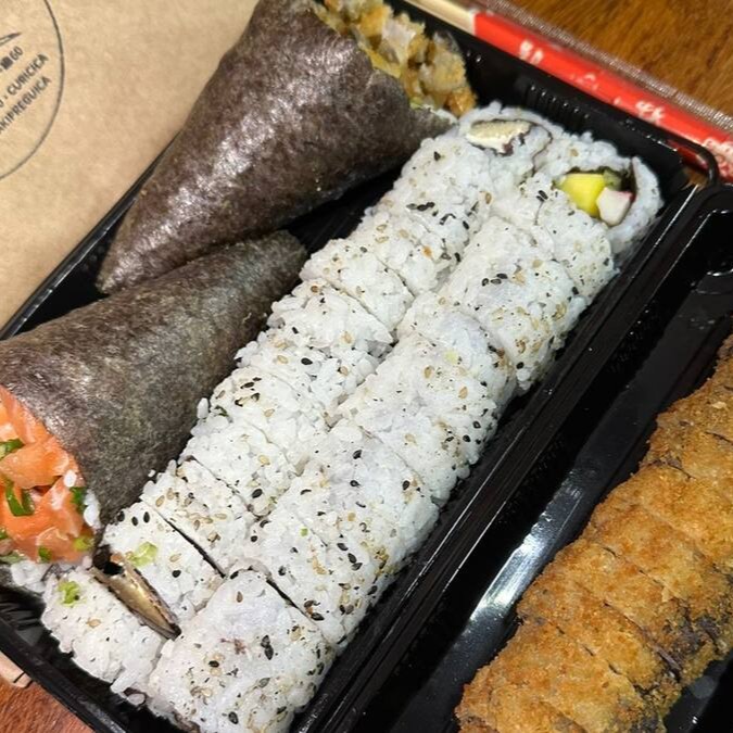 06 sashimi de salmão + 04 Filadélfia + 04 enrolados de atum com cream cheese + 06 hot Filadélfia + 05 crocantes de salmão