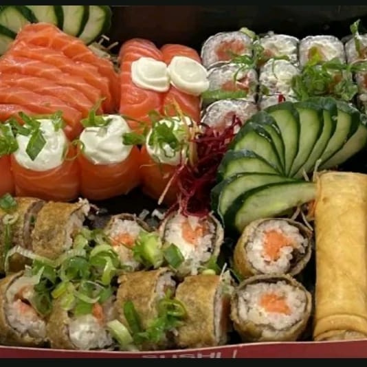 12 tekka maki 12 hots salmão 6 Joe 6 sashimi salmão 2 sushi fhiladelfia 1 harumaki de banana com goibada 1 harumaki de camarão