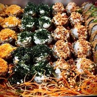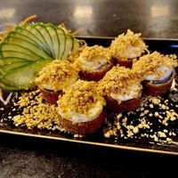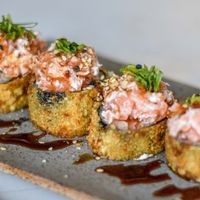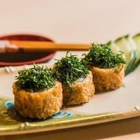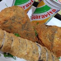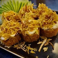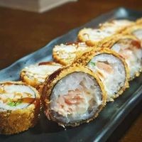 Arroz, alga, salmão, cream cheese, empanado e frito.