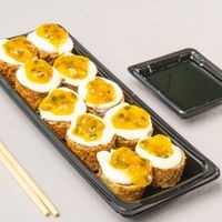 Arroz, nori, cream cheese, salmão, mais cream cheese e geleia de maracujá.
