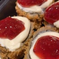 Arroz, nori, cream cheese, salmão, mais cream cheese e geleia de morango.