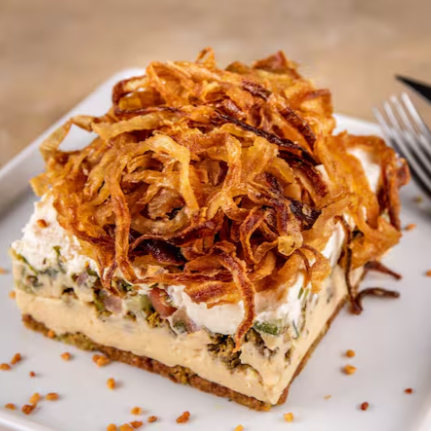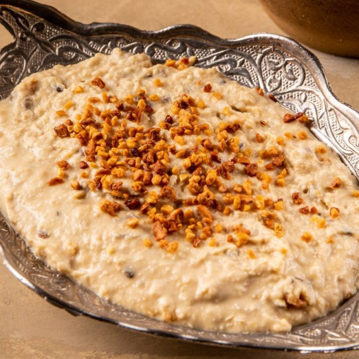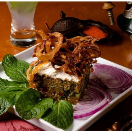 camada com mix de kibe, tabule, carne com temperos árabes, hummus, coalhada e coberta com cebola crispy