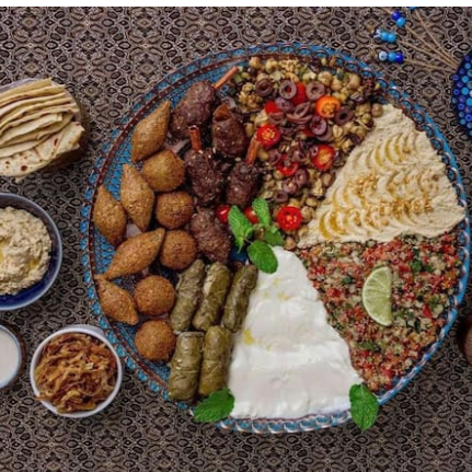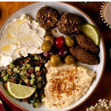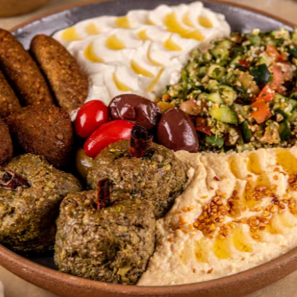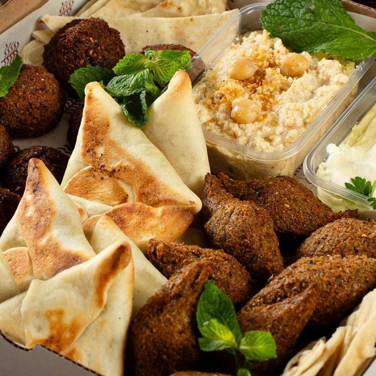 2 mini kafta, 2 mini kibes, porção de tabule, coalhada, babaganoush, hommus tahine, mix azeitona, pão árabe.
