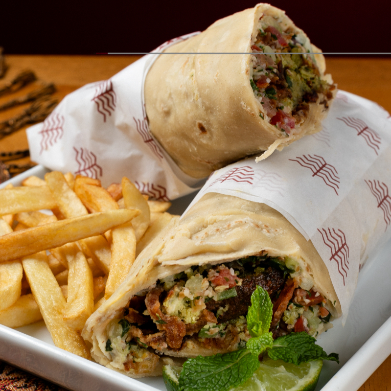 Sanduiche de carne bovina, envolto no pão folha, regado ao molho taratur, com uma salada especial, com cebola crispy, acompanha porção de batata frita.