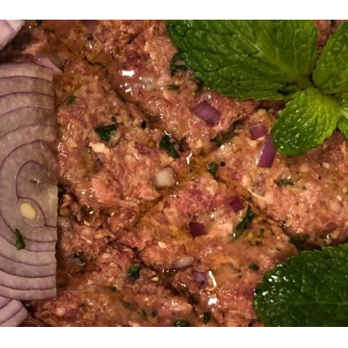 camada de kibe cru, carne moída refogada com especiarias árabes e coalhada, coberta com cebola crispy