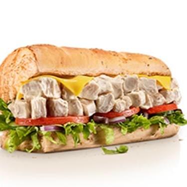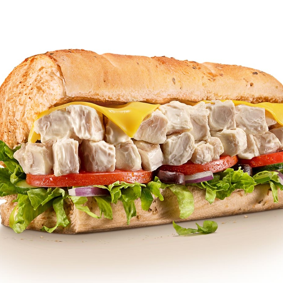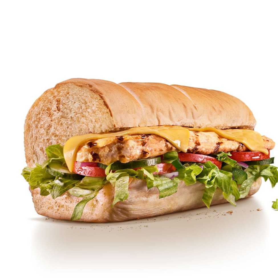 Receita Exclusiva: cubos de frango defumado com cream cheese com pão a sua escolha, contendo alface, tomate, queijo suíço e parmesão. Apenas um item promocional por pedido. Campanha válida somente em dias e horários promocionais, ou até a duração dos estoques. Imagem ilustrativa