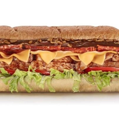 Pão a sua escolha (sugestão: pão integral), Frango Teriyaki, queijo cheddar fatiado em dobro, pepperoni, cebola crispy, alface, tomate, molho barbecue e molho cebola agridoce;