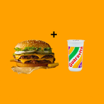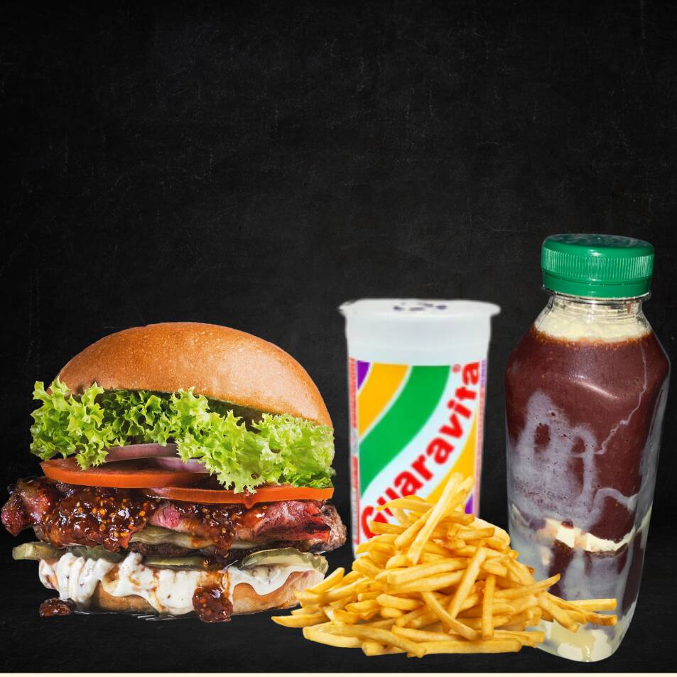 HAMBURGUER DUPLO: 2 CARNES, 2 OVOS, BACON, 2 QUEIJOS CHEDDAR, 2 PRESUNTOS, CALABRESA E SALADA + GUARACAMP