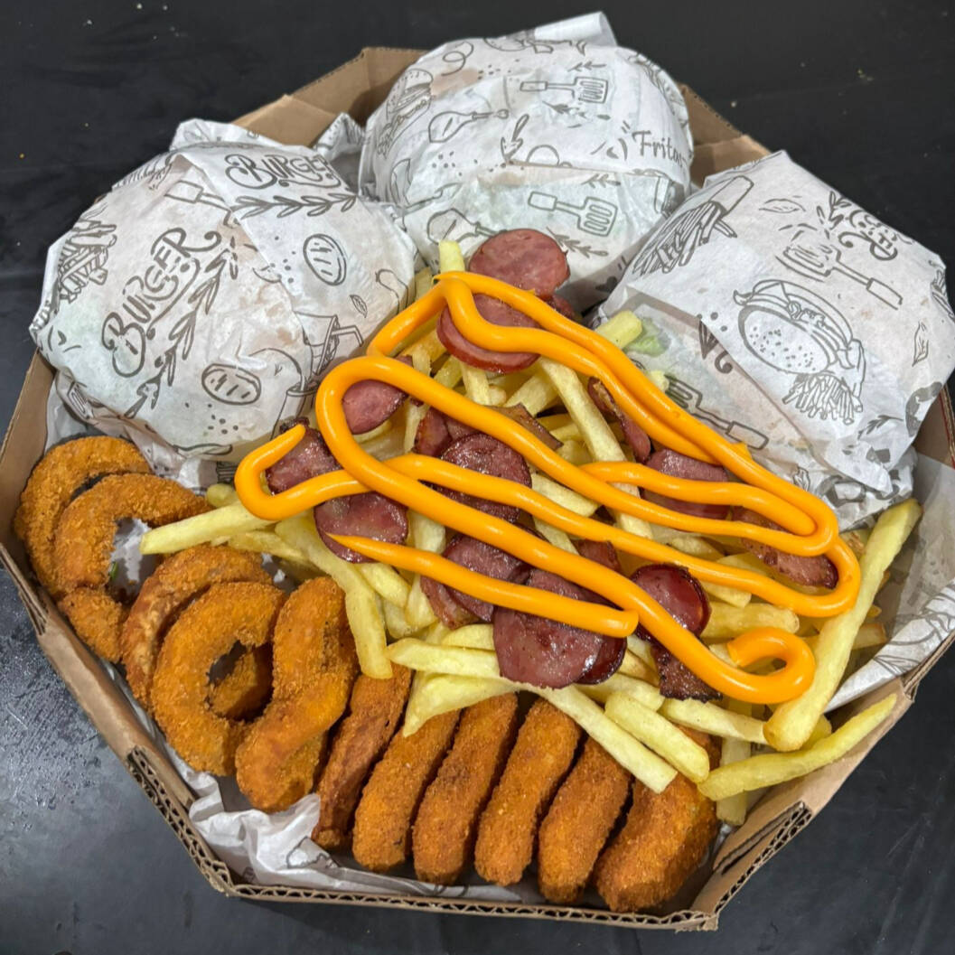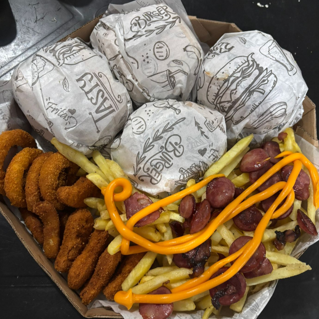 3 x-tudos + Anéis de cebola, Nugget, calabresa, 400G de batata frita e cheddar.