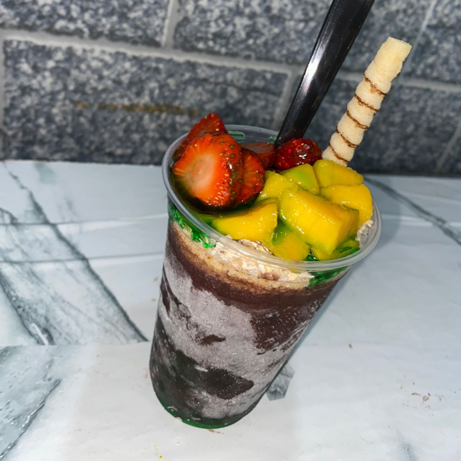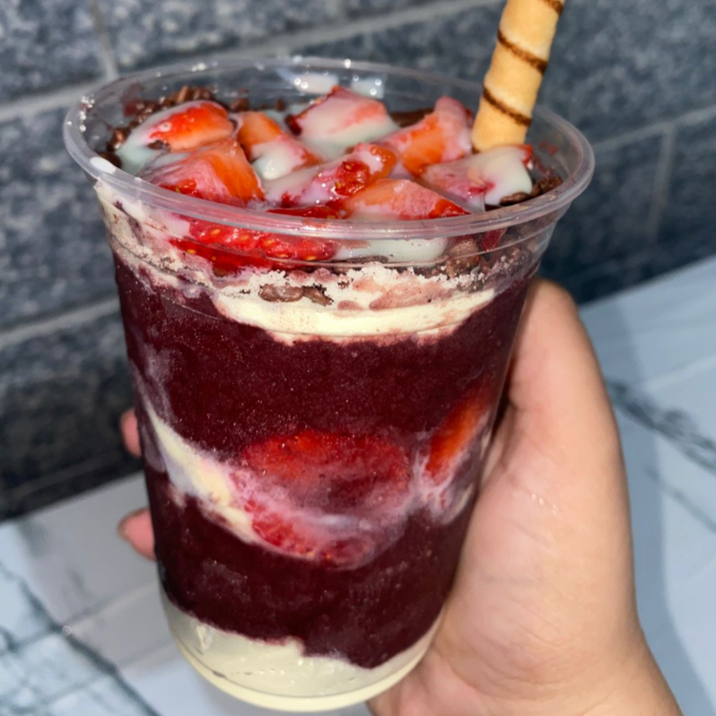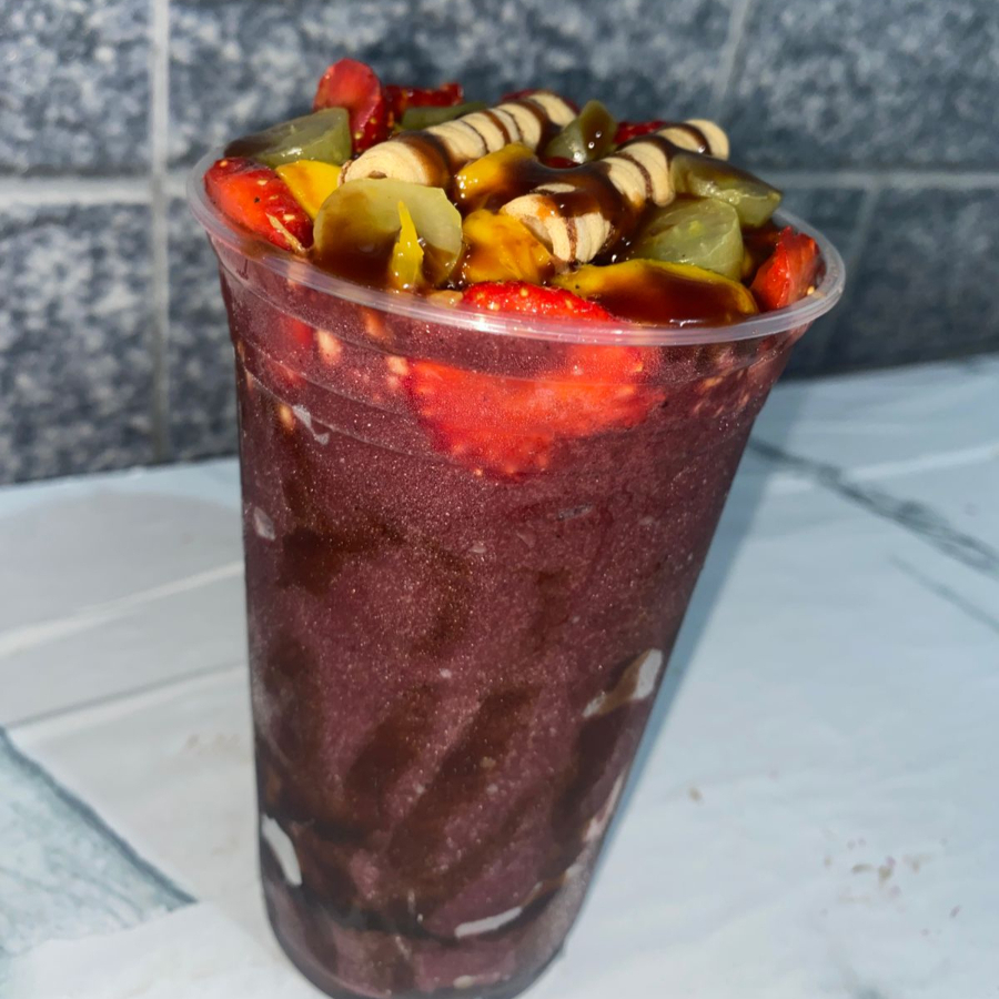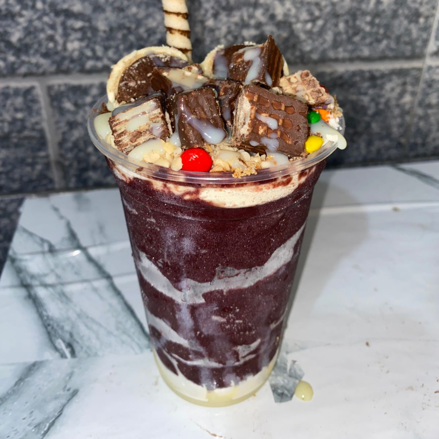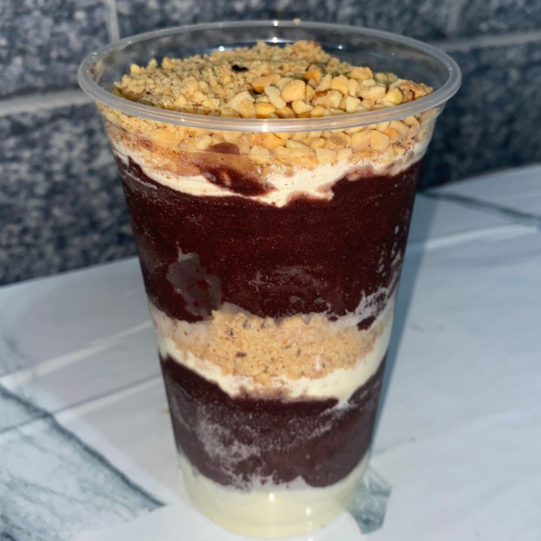 Açaí gigante super recheado com 3 camadas no copo. Com leite em pó, amendoim, e paçoca.