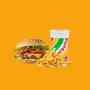 X-tudp com carne bovina, ovo, bacon, calabresa, salada, presunto e cheddar + porção de batata sequinha e guaravita.