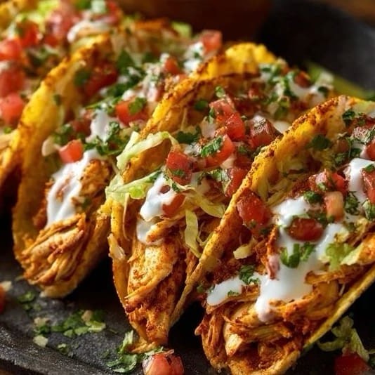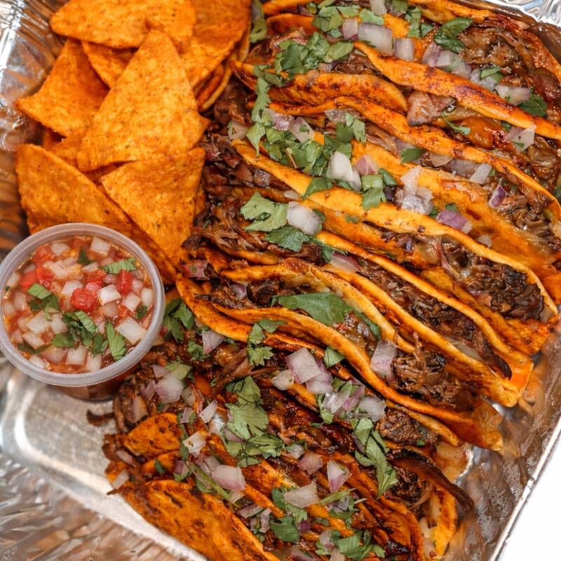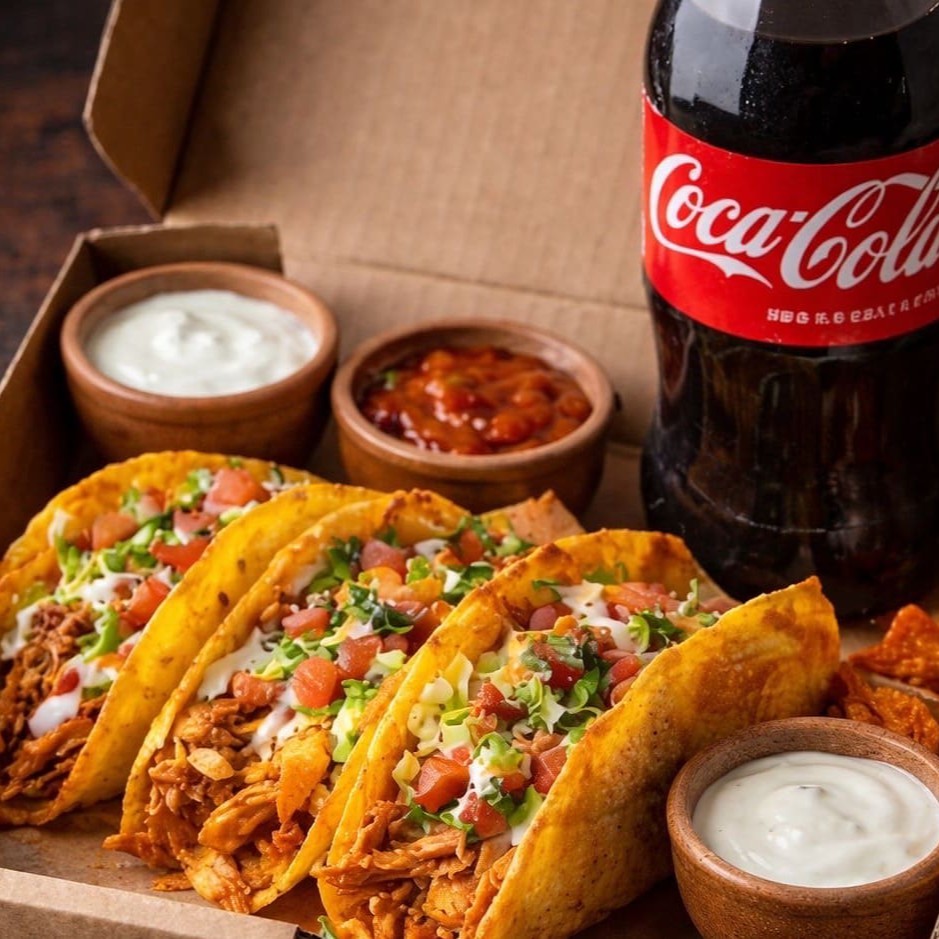 6 tacos crocantes recheados com carne desfiada suculenta, finalizados com tomate, cebola, cheiro-verde e molho cremoso especial. Acompanha Doritos crocantes, dois molhos da casa e Coca-Cola gelada.