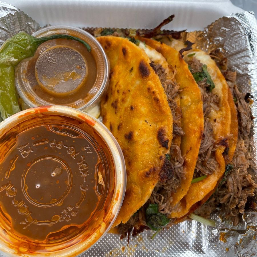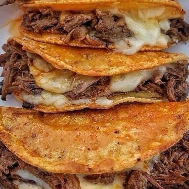Tortilha dourada na chapa, recheada com carne bovina desfiada suculenta e queijo derretido, selada até ficar crocante por fora e macia por dentro. Street food de verdade.