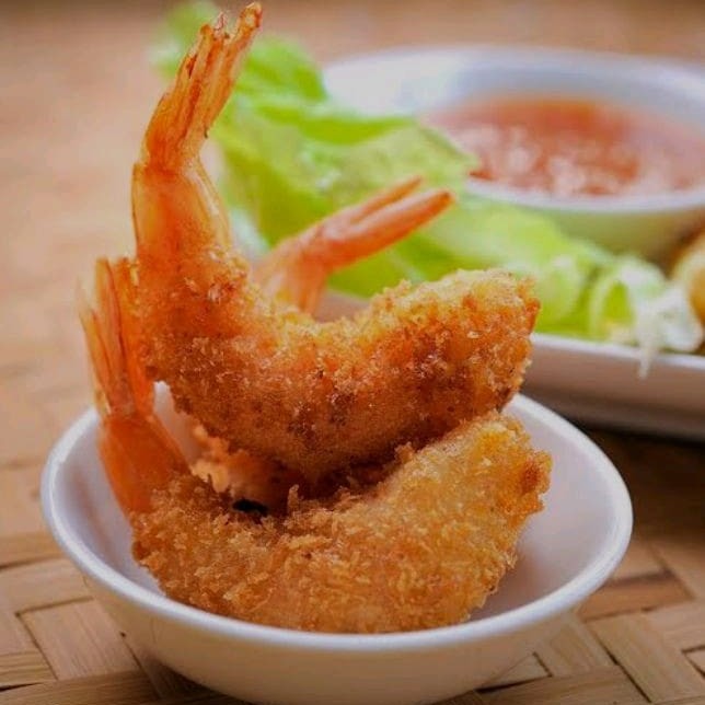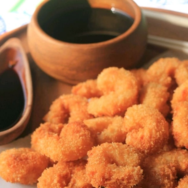 Camarão grande temperado e empanado na farinha Panco(frito) acompanhados com um molho da casa especial ( molho a base de cream cheese e geleia de pimenta, levemente picante)