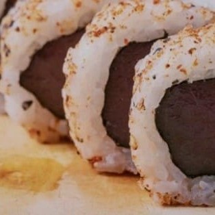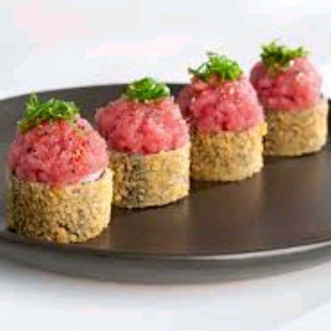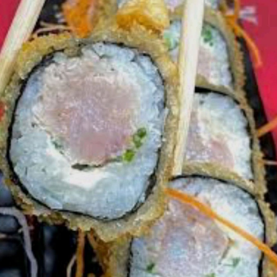 Filé de atum + arroz japonês + creme cheese + cebolinha + gergelim ( hol empanado na farinha Panco e frito finalização com atum crú)