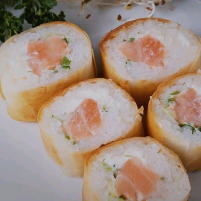 Massinha crocante de harumak, recheada com arroz japonês, creme chess, cebolinha e filé de salmão frito bem crocante