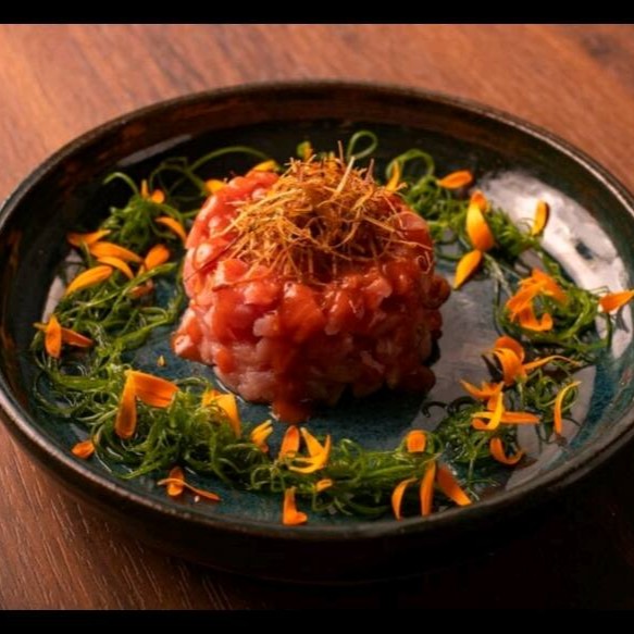 Filé de atum + azeite trufado + molho do chefe ( molho a base de limão siciliano e creme cheese) finalizado com cebolinha e alga nori .
